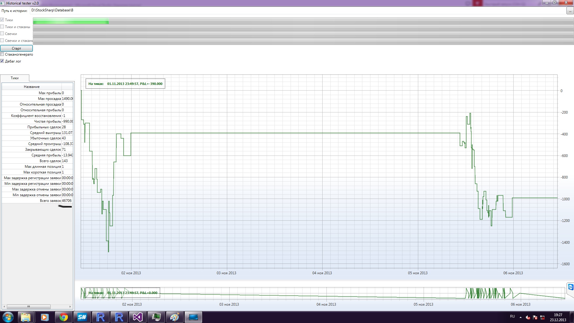 Версия 4.2.1.5 стандартный тестер, изменена только стратегия и выбраны свечи "ренко". Данные по RIZ3 с 1-го ноября. Нормально проходит тест одного дня, потом происходит "подвисание", отжирается вся оперативная память (15 из 16ти гигабайт), тестирование фактически останавливается, лог начинает прирастать десятками мегабайт, заявки сыпятся тысячами. Лог прилагаю (успел отсечт на второй сотне мегабайт - он прирастает ну оооочень быстро). Скрины тоже прилагаю (запустил и подождал несколько подольше). Рекорд ожидания - ~11 гб лог-файл.