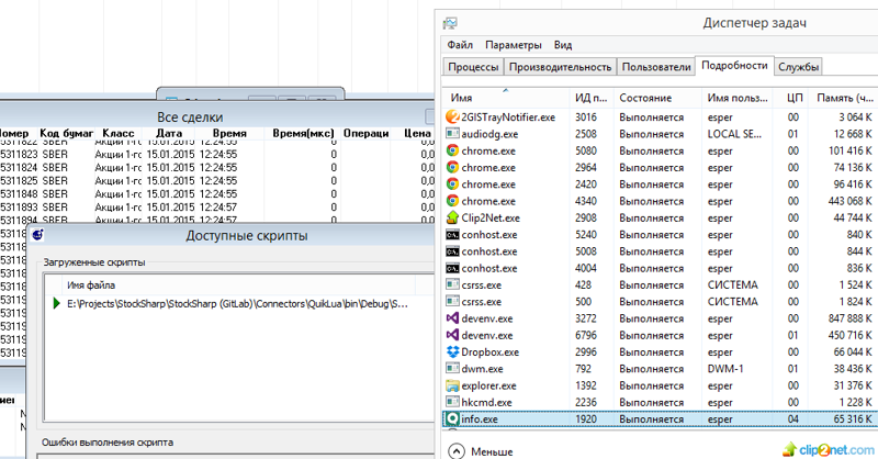 RomSunZ Да, нагрузка на процессор от процесса info.exe начинает расти сразу после запуска скрипта, кроме квика больше ничего не запущено. В логах QuikLua при этом что-то пишется?