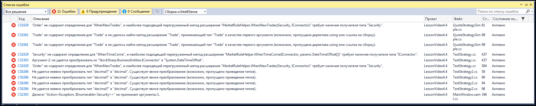 http://o-s-a.net/)Я не особо удивился этим 11 ошибкам. Я ждал их ))). С каждым апдейтом API вы чего-то там перепиливаете не особо задумывась об обратной совместимости. Страдаем от этого мы, пользователи ваших библиотек. Оправдывает вас лишь одно, что библиотеки халявны. Целый день я убил на исправление данных ошибок. И когда я запустил проект с новым API 4.3.19.5 - я был очень счастлив, но не долго ))). Меня ждал новый удар: заявки перестали отправлятсья в Квик. И эту проблему я решил. Но матерился я сильно и долго ))). Кстати, конкурирующий проект Os.Engine нехило так развивается. Но хозяин там А.Ван - редкостный дундук с завышенным ЧСВ, занёс меня в чёрный список на смартлабе ))). Комменты мои подтёр, причём безобидные, и занёс меня в ЧС - вот же придурок! И начал он свой проект, с обсёра конкурентов