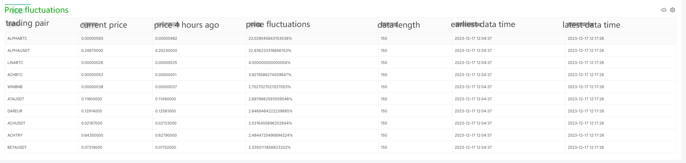 cols : ["trading pair", "current price", "price 4 hours ago", "price fluctuations", "data length", "earliest data time", "latest data time"],