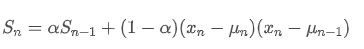 Regarding variance, we need to calculate the exponential weighted average of squared deviations at each time point. This can be achieved through the following recursive relationship: