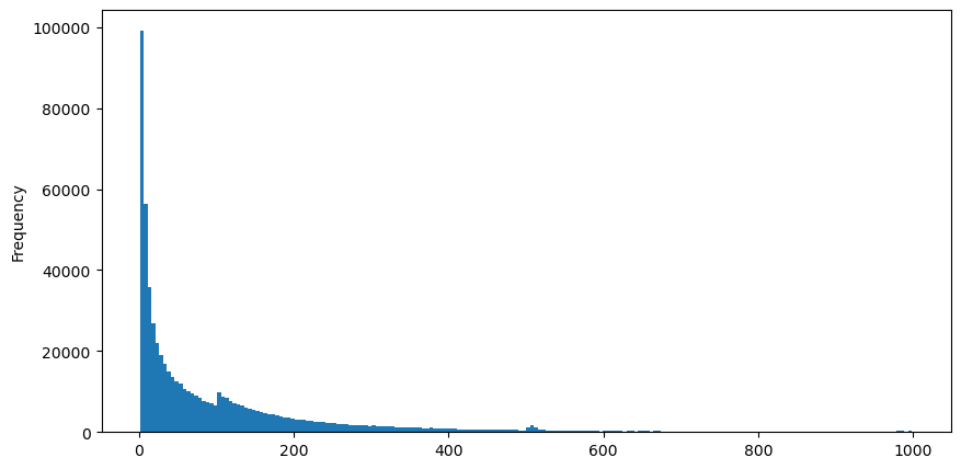 buy_trades['interval'][buy_trades['interval']<1000].plot.hist(bins=200,figsize=(10, 5));