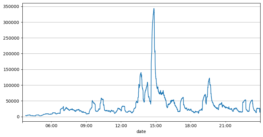result_df['quantity_sum'].rolling(1000).mean().plot(figsize=(10,5),grid=True);