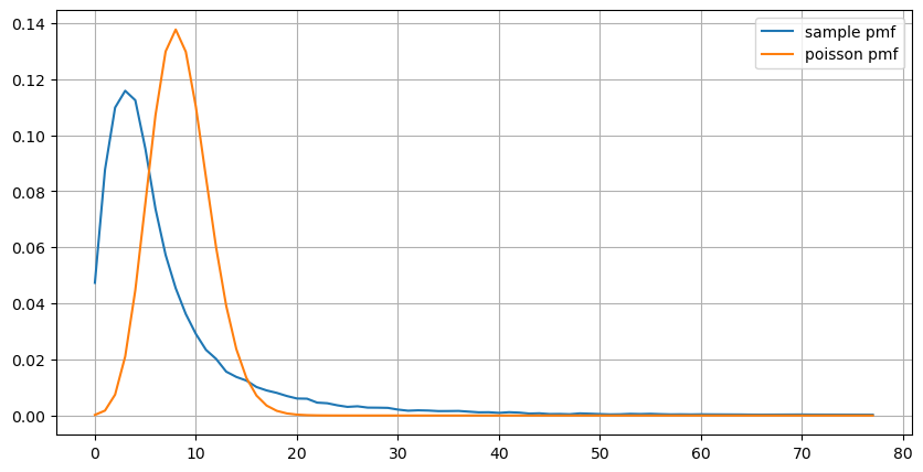 (count_df/count_df.sum()).plot(figsize=(10,5),grid=True,label='sample pmf');