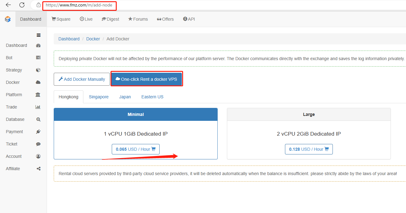 2. DockerIf you want to run a program instance, you must deploy a docker. The deployment of the docker is also very simple, and there are deployment tutorials on the platform. You can also use the 'One-click Deployment' provided by FMZ to deploy automatically on servers rented on behalf of FMZ.
