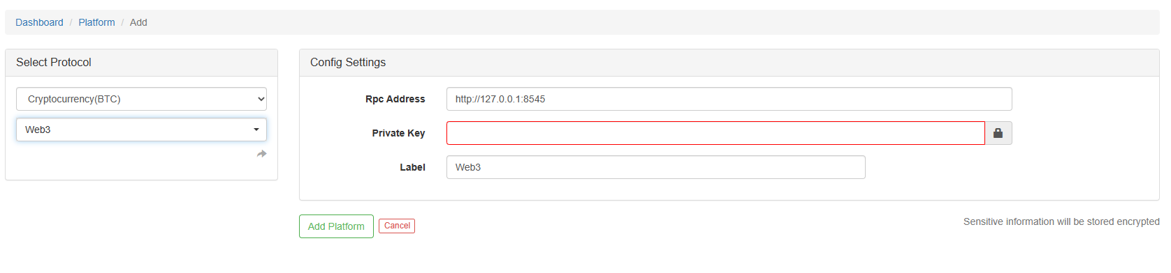 Select ```Web3```, configure RPC node address, configure private key, you can click the lower right corner "Sensitive information will be stored encrypted" to view the security mechanism.