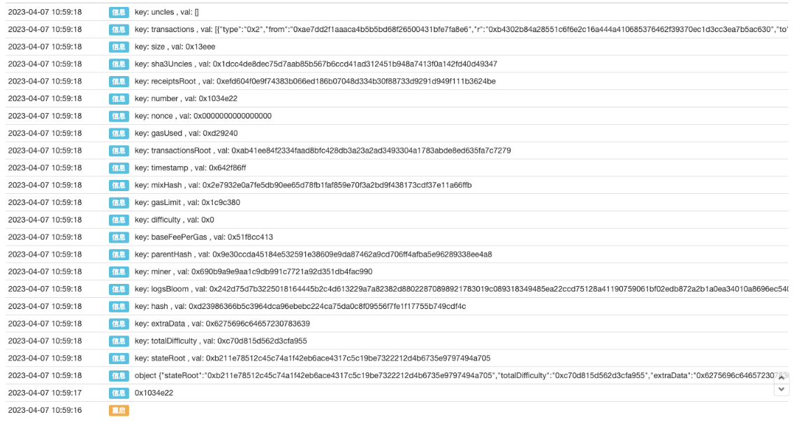 // Due to the excessive content of Log output, it will be truncated automatically, so traverse each field of the returned block information and print them one by one