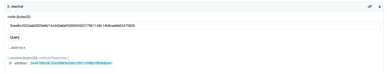 Methods for Calling Smart ContractsNext, you can call the ```resolver``` method of the ENS smart contract, which returns the address of the ```ENS: Public Resolver``` contract.