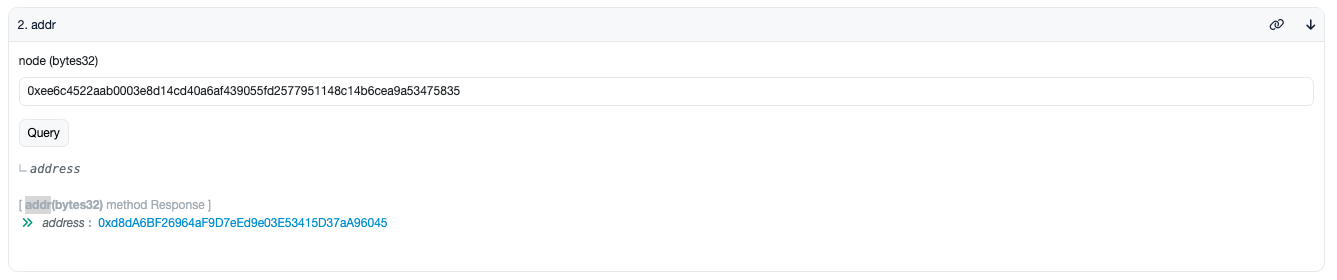 Finally, call the ```ENS: Public Resolver``` contract's ```addr``` method, with the parameter still being ```ensNode```.