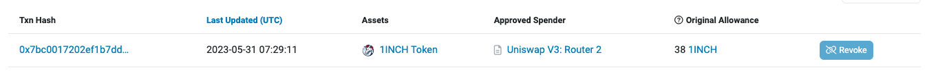 We still use the ```1INCH -> ETH``` exchange as an example, use the ```approve``` method of ```ERC20``` to give the ```Uniswap``` router contract authorization to operate the ```1INCH``` tokens in the currently configured wallet.