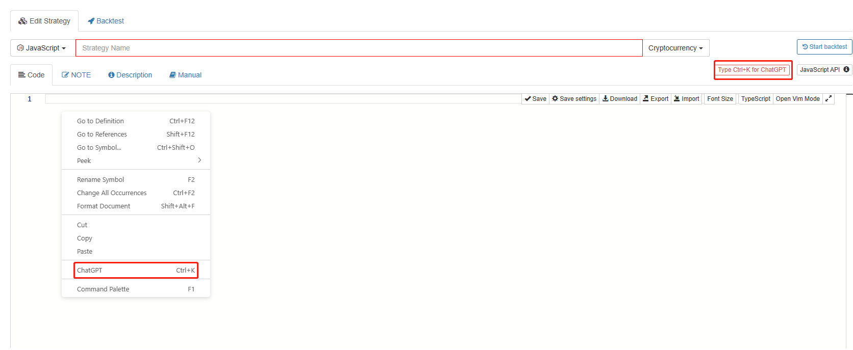With the development of AI technology, solutions to these problems can be found to some extent. The recently popular **ChatGPT** can be used as a tool for quantitative trading learning, research, and creation. With FMZ platform's new upgrade for strategy editor and integration with ChatGPT, it improves the productivity of quantification greatly. Let's explore **the new functions of FMZ strategy editor** together!