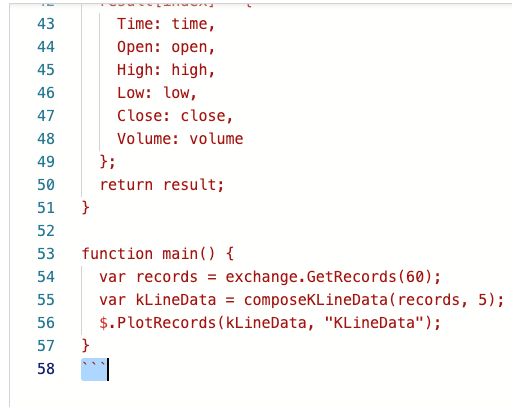 Sometimes ```ChatGPT``` adds ``` symbols to wrap the code, which in markdown indicates that the wrapped content is code. So we just need to remove the first and last lines. Since I asked it to use ```$.PlotRecords(KLineData, "name")``` for drawing, the strategy needs to reference a drawing library in order to draw. The purpose of drawing is to verify whether the K-line data synthesized by Chat GPT's code is correct.