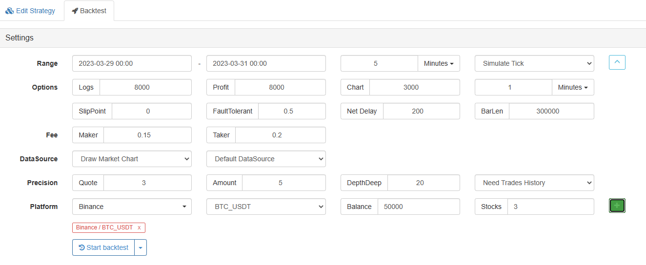 The code provided by ```ChatGPT``` can be backtested directly. I set the default K-line period of the backtesting system as 5 minutes, which is used for comparing with K-line charts drawn from K-line data calculated by Chat GPT's algorithm.