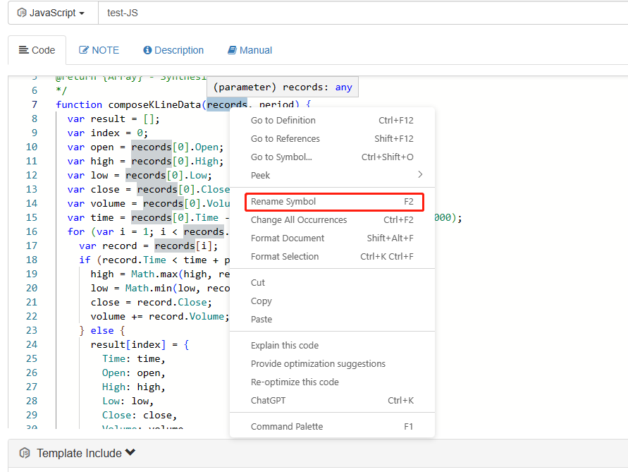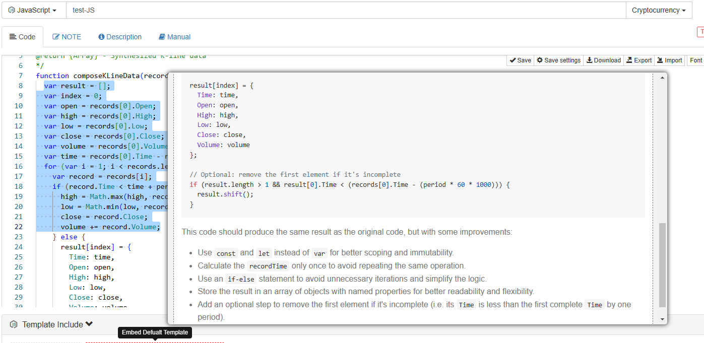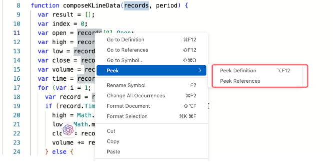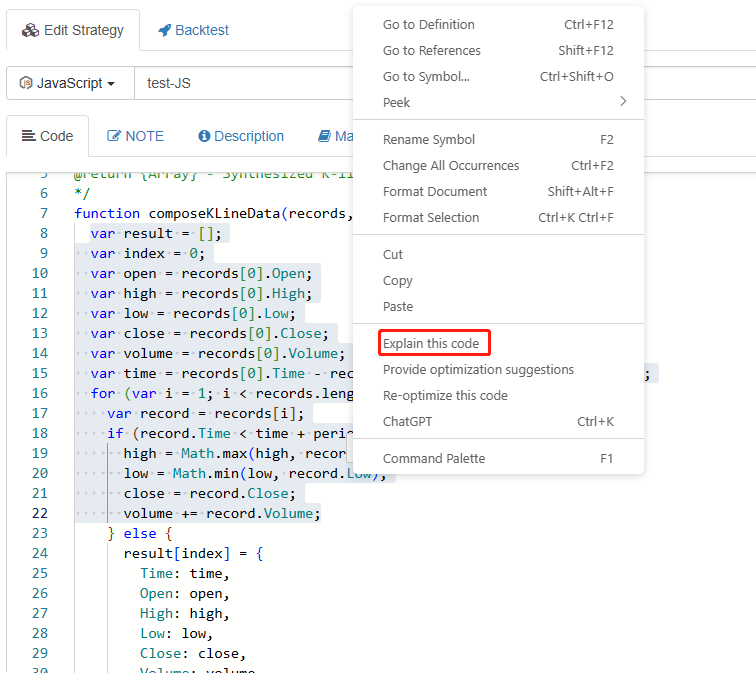 Use ChatGPT to explain codeFMZ's integrated ChatGPT not only helps you write code, but also helps you explain the code. Select the ```composeKLineData``` function in the code just written by ChatGPT, right-click to show the menu:
