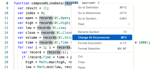Modify all the same contentChange All Occurrences, select a variable name, word, and edit all the same content in the text simultaneously.