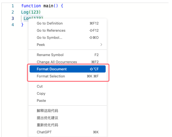 Formatting (code optimization, automatic alignment format)Format Selection, format the selected code.