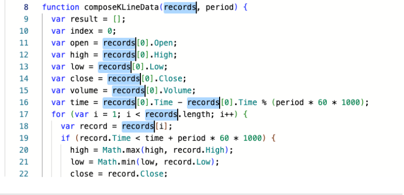 var kLineData = composeKLineData(records, 5); // Synthesize 5-minute K-line data
