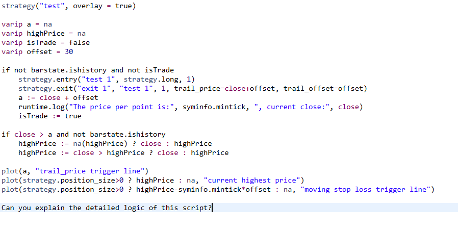 plot(strategy.position_size>0 ? highPrice-syminfo.mintick*offset : na, "moving stop loss trigger line")