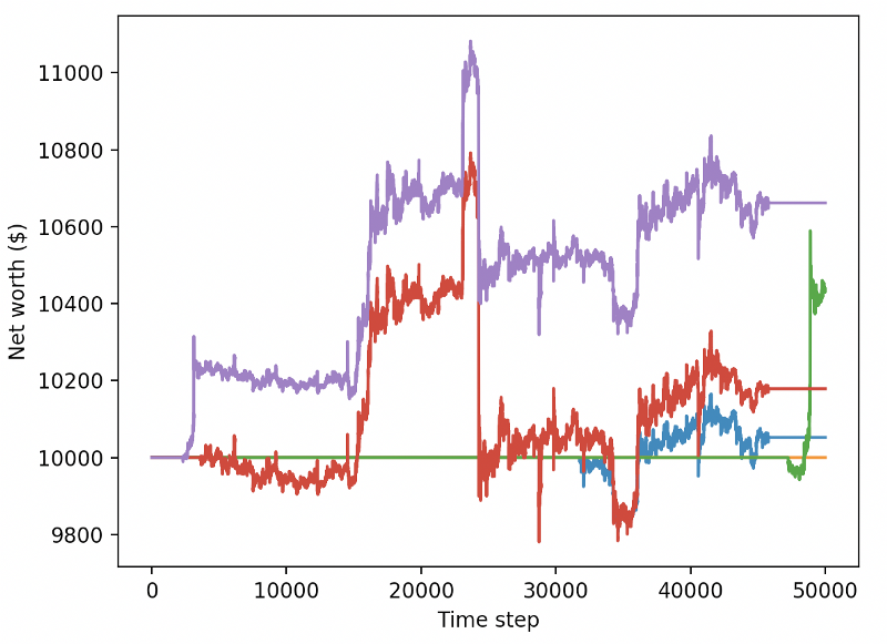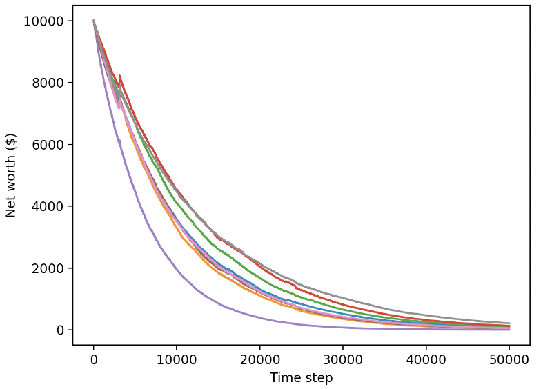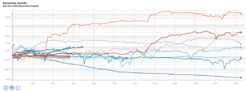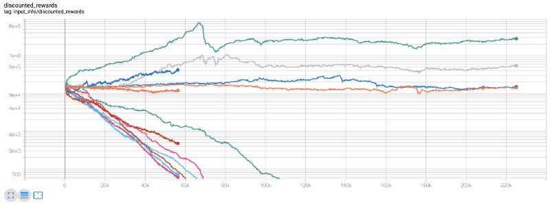Wow, it seems that our robot is very profitable! Our best robot can even achieve 1000x balance in 200,000 steps, and the rest will increase at least 30 times on average!