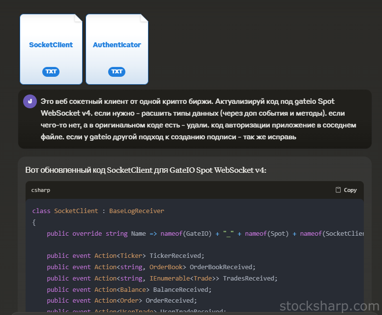 Now it’s time to set up the WebSocket client for the new exchange. For example, let's take GateIO Spot WebSocket v4. Claude.ai helps generate code, but this is where our ongoing battle with inaccuracies begins. The AI often generates code that theoretically seems correct, but in practice, needs to be supplemented and fixed.