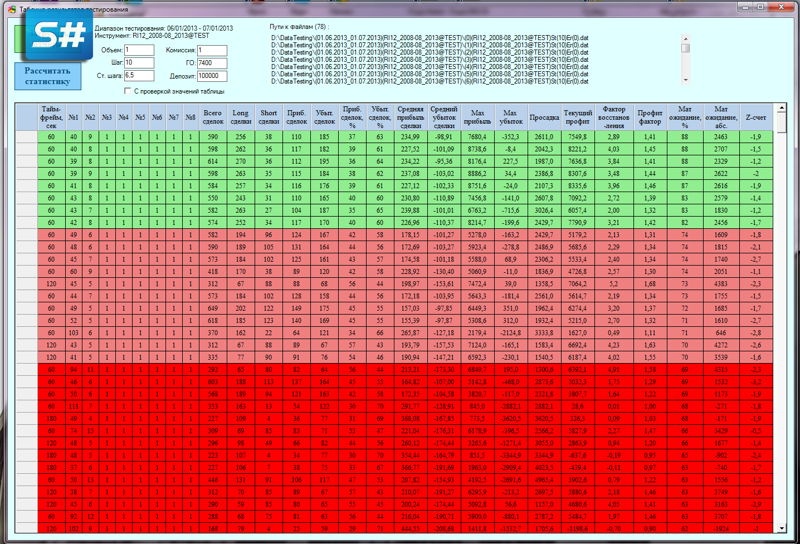 В конце мы получили число массивов с результатами тестирования равное числу всех возможных параметров нашей стратегии. Сохраняем (сериализуем в бинарный файл) все наши параметры и результаты тестирования. Открываем эти файлы в рассмотренном ранее «Анализаторе», рассчитываем по этим данным статистику и получаем итоговую таблицу с результатами тестирования. Сортируем данные, например, по матожиданию и анализируем результаты. При этом можем сразу визуализировать заинтересовавшую нас стратегию.