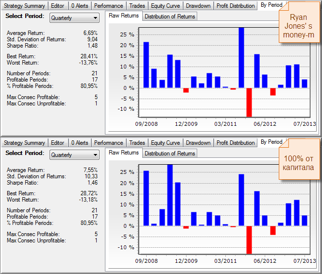 На графиках так и не понял, что такое "100% от капиталла". Увидел, что отличие ММ-Джонса от классического (процент от капиталла) - фракционность (сегментированность). Кстати, удивляет, что очевидные вещи называют именами и даже книжки какие-то выпускают. Ведь подобный ММ самостоятельно приходит на начальном этапе развития чуть ли не каждому алготрейдеру, который хоть немного не ленился покрутить варианты ММ.