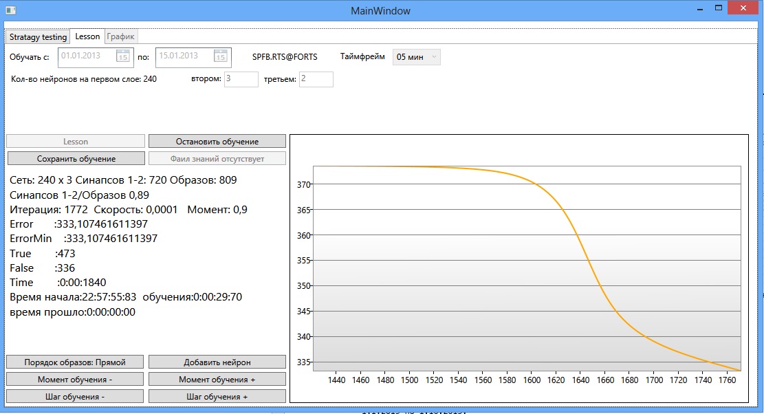 я задал первые 15 дней года, всего 809 образов получилось. Также задается таймфрайм, количество нейронов на втором и третьем слое. При этом если в третьем слое поставить 0, то сеть будет двухслойная. В ходе обучения, можно изменять, шаг обучения, момент, порядок предоставления образов. На графике видна среднеквадратичная ошибка сети. Также видна статистика обучения сети. При обновлении минимума ошибки, класс сети сохраняется. Рис 3.Когда дальнейшее обучение сети бесполезно, останавливаем обучение. Переходим на вкладку Stratagy testing.Рис 4.