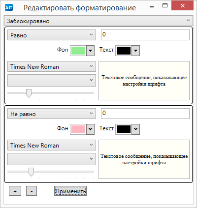 В качестве примера рассмотрим настройку форматирования столбца Заблокировано таблицы Позиций, если значение Заблокировано равно 0 - фон ячейки установим в зеленый цвет, иначе - красный. Окно настроек форматирования для данных условий показано на рисунке ниже.