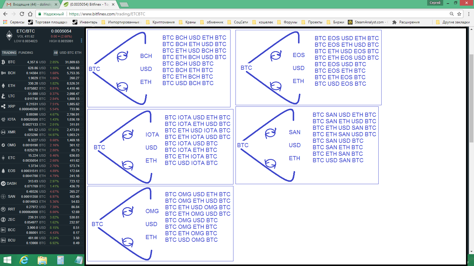 3) Почти всегда цепочки сразу не закрываются (подозреваю что с межбирживым арбитражем будет так же ) потому как покупка происходит на резких движения цены и наши ордера не всегда успевают исполнится по нужной цене (зависают на не определенный срок) - придется ждать пока ордера исполнятся, ведь только после закрытия всей цепочки по запланированным ценам вы получите прибыль. И так в процессе торговли у вас может зависнуть куча ордеров по разным парам, а BTC/USD продолжает рост и сделал еще 5%, а вы ждете пока заработаете свои копеечки - считайте что вы потеряли 5% от депо!